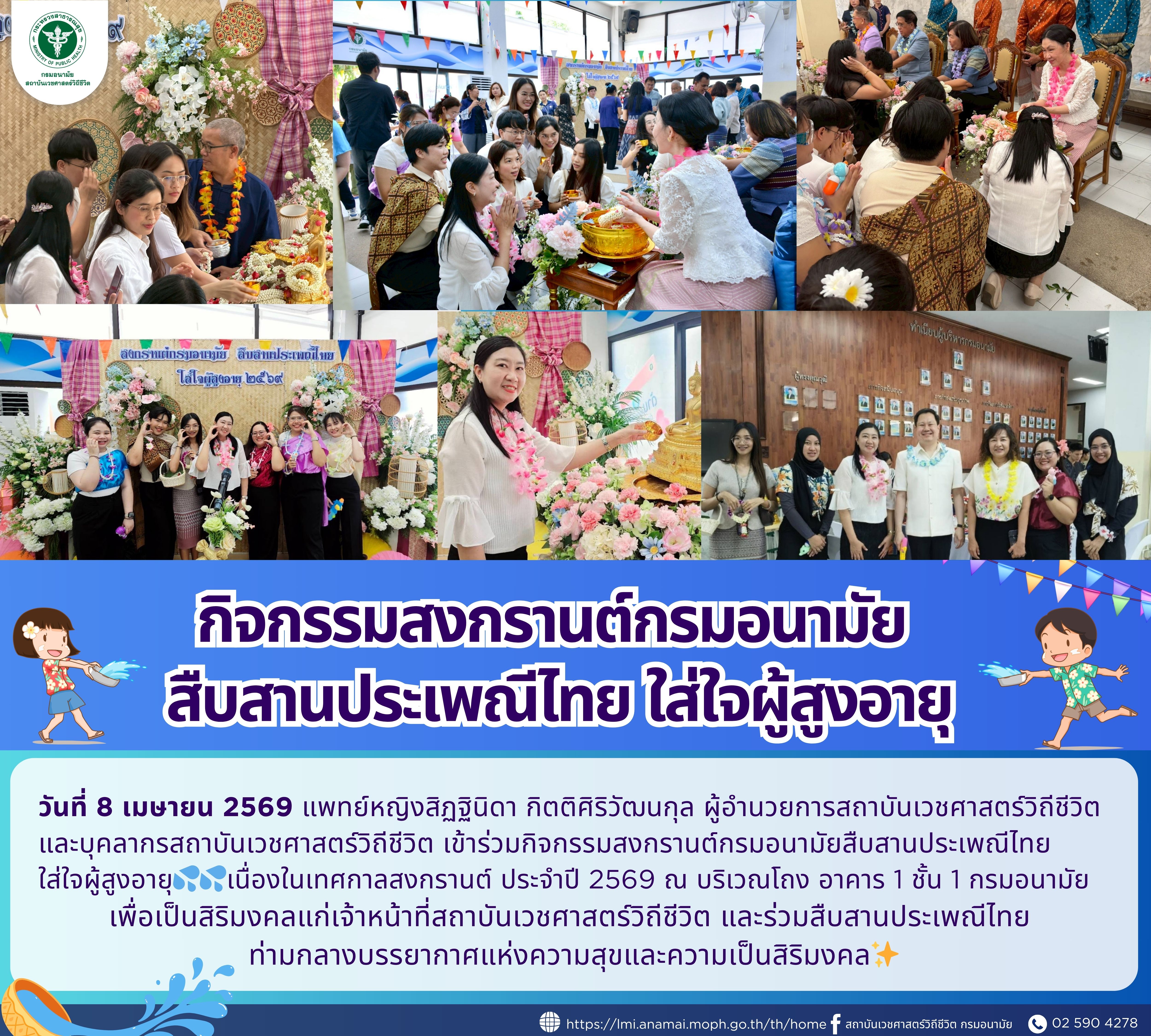 แพทย์หญิงสิฏฐินิดา กิตติศิริวัฒนกุล ผู้อำนวยการสถาบันเวชศาสตร์วิถีชีวิต และบุคลากรสถาบันเวชศาสตร์วิถีชีวิต เข้าร่วมกิจกรรมสงกรานต์กรมอนามัย สืบสานประเภณีไทย ใส่ใจผู้สูงอายุเนื่องในเทศกาลสงกรานต์ ประจำปี 2569 ณ บริเวณโถง อาคาร 1 ชั้น 1 กรมอนามัย เพื่อเป็นสิริมงคลแก่เจ้าหน้าที่สถาบันเวชศาสตร์วิถีชีวิต และร่วมสืบสานแระเพณีไทย ท่ามกลางบรรยากาศแห่งความสุขและความเป็นสิริมงคล