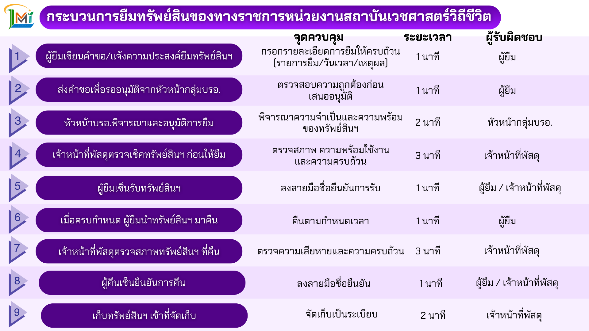 กระบวนการดังกล่าวกำหนดขั้นตอนการดำเนินงานอย่างชัดเจน จำนวน 9 ขั้นตอน ครอบคลุมตั้งแต่การยื่นคำขอ การพิจารณาอนุมัติ การตรวจสอบทรัพย์สิน การรับ–คืน และการจัดเก็บ โดยระบุผู้รับผิดชอบและระยะเวลาดำเนินการในแต่ละขั้นตอนอย่างชัดเจน
