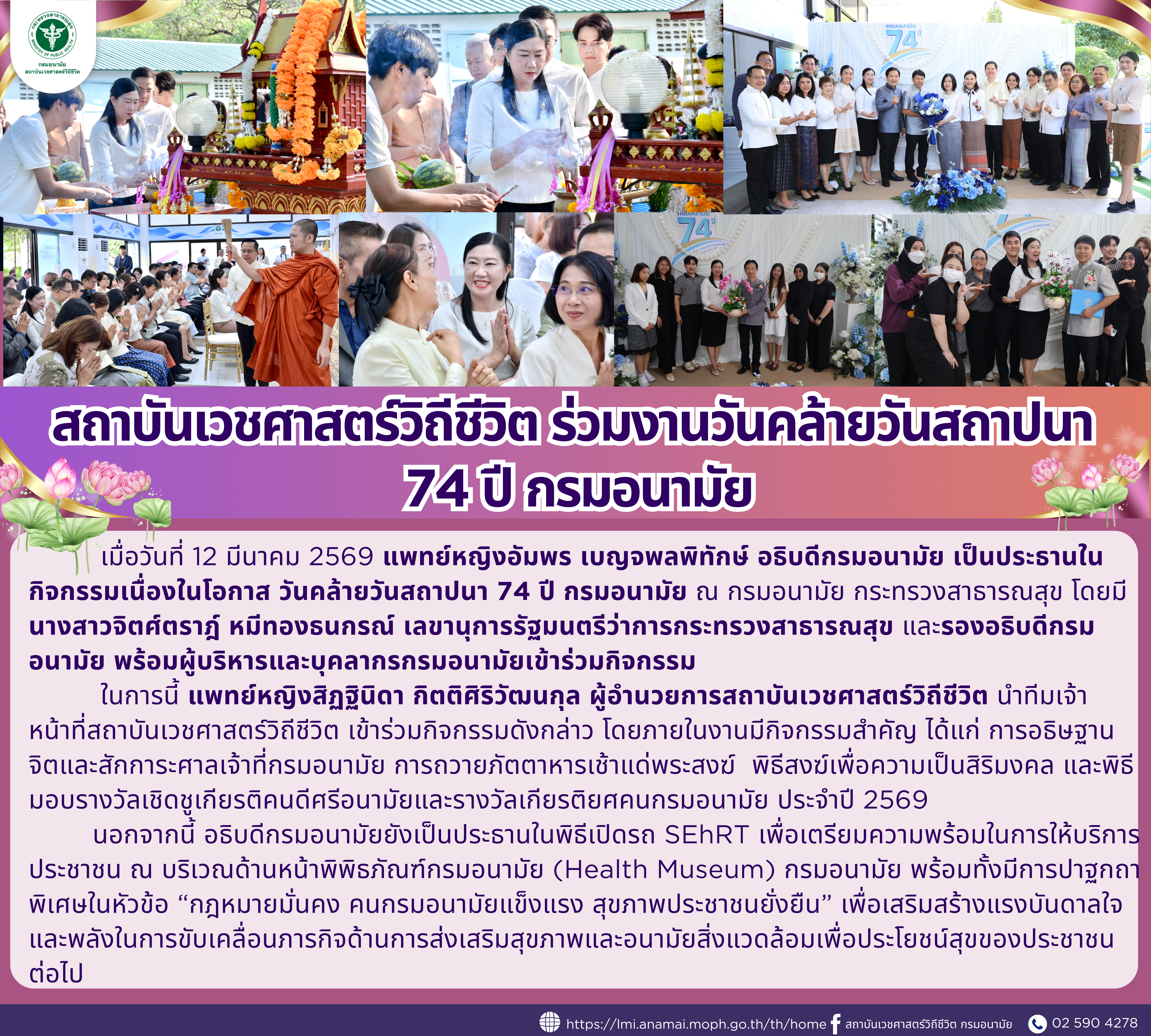 เมื่อวันที่ 12 มีนาคม 2569 แพทย์หญิงอัมพร เบญจพลพิทักษ์ อธิบดีกรมอนามัย เป็นประธานในกิจกรรมเนื่องในโอกาส วันคล้ายวันสถาปนา 74 ปี กรมอนามัย ณ กรมอนามัย กระทรวงสาธารณสุข โดยมี นางสาวจิตศ์ตราฎ์ หมีทองธนกรณ์ เลขานุการรัฐมนตรีว่าการกระทรวงสาธารณสุข และรองอธิบดีกรมอนามัย พร้อมผู้บริหารและบุคลากรกรมอนามัยเข้าร่วมกิจกรรม