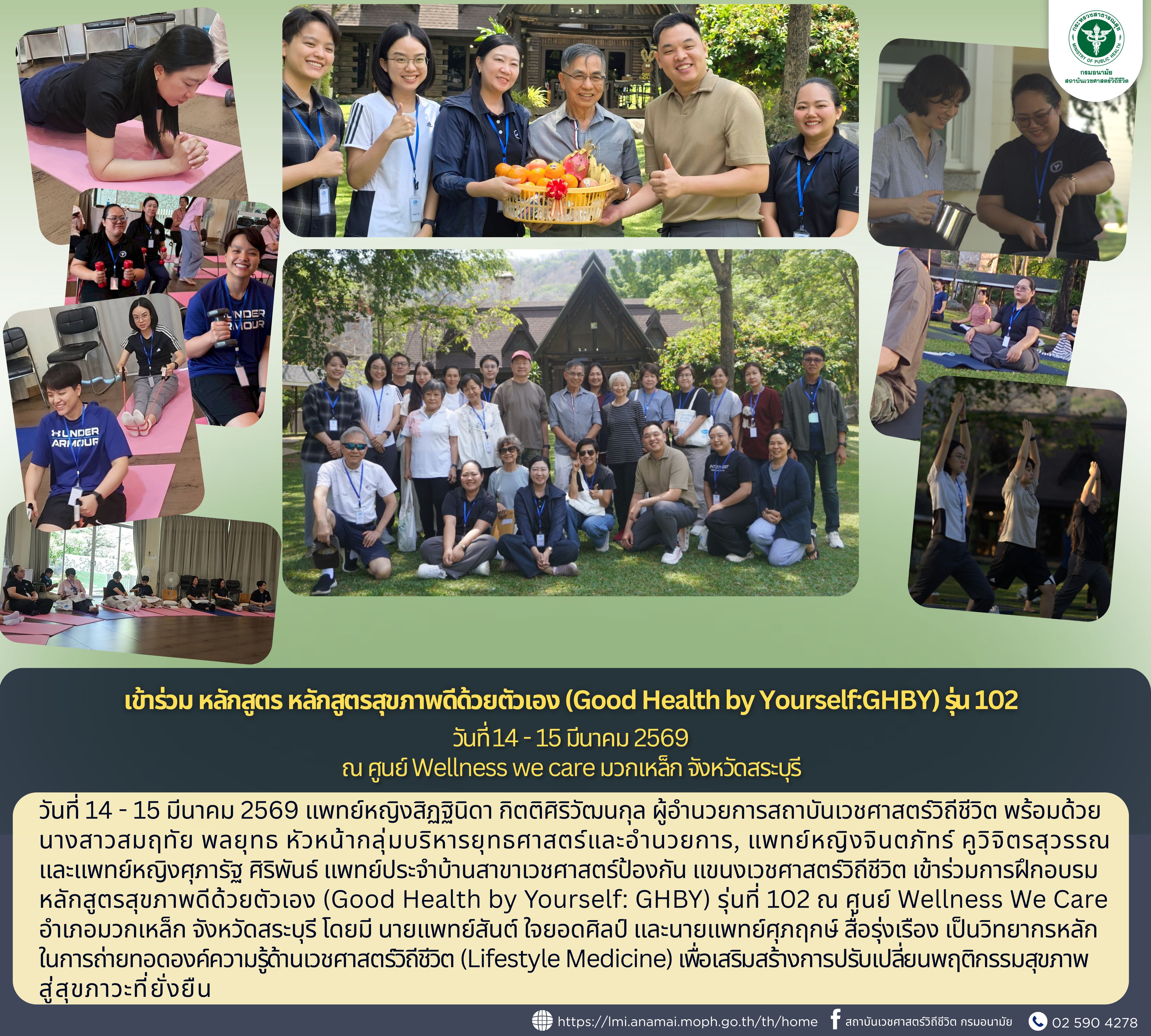 วันที่ 14 - 15 มีนาคม 2569 แพทย์หญิงสิฏฐินิดา กิตติศิริวัฒนกุล ผู้อำนวยการสถาบันเวชศาสตร์วิถีชีวิต พร้อมด้วย นางสาวสมฤทัย พลยุทธ หัวหน้ากลุ่มบริหารยุทธศาสตร์และอำนวยการ, แพทย์หญิงจินตภัทร์ คูวิจิตรสุวรรณ และแพทย์หญิงศุภารัฐ ศิริพันธ์ แพทย์ประจำบ้านสาขาเวชศาสตร์ป้องกัน แขนงเวชศาสตร์วิถีชีวิต เข้าร่วมการฝึกอบรมหลักสูตรสุขภาพดีด้วยตัวเอง (Good Health by Yourself: GHBY) รุ่นที่ 102 ณ ศูนย์ Wellness We Care อำเภอมวกเหล็ก จังหวัดสระบุรี โดยมี นายแพทย์สันต์ ใจยอดศิลป์ และนายแพทย์ศุภฤกษ์ สื่อรุ่งเรือง เป็นวิทยากรหลักในการถ่ายทอดองค์ความรู้ด้านเวชศาสตร์วิถีชีวิต (Lifestyle Medicine) เพื่อเสริมสร้างการปรับเปลี่ยนพฤติกรรมสุขภาพสู่สุขภาวะที่ยั่งยืน