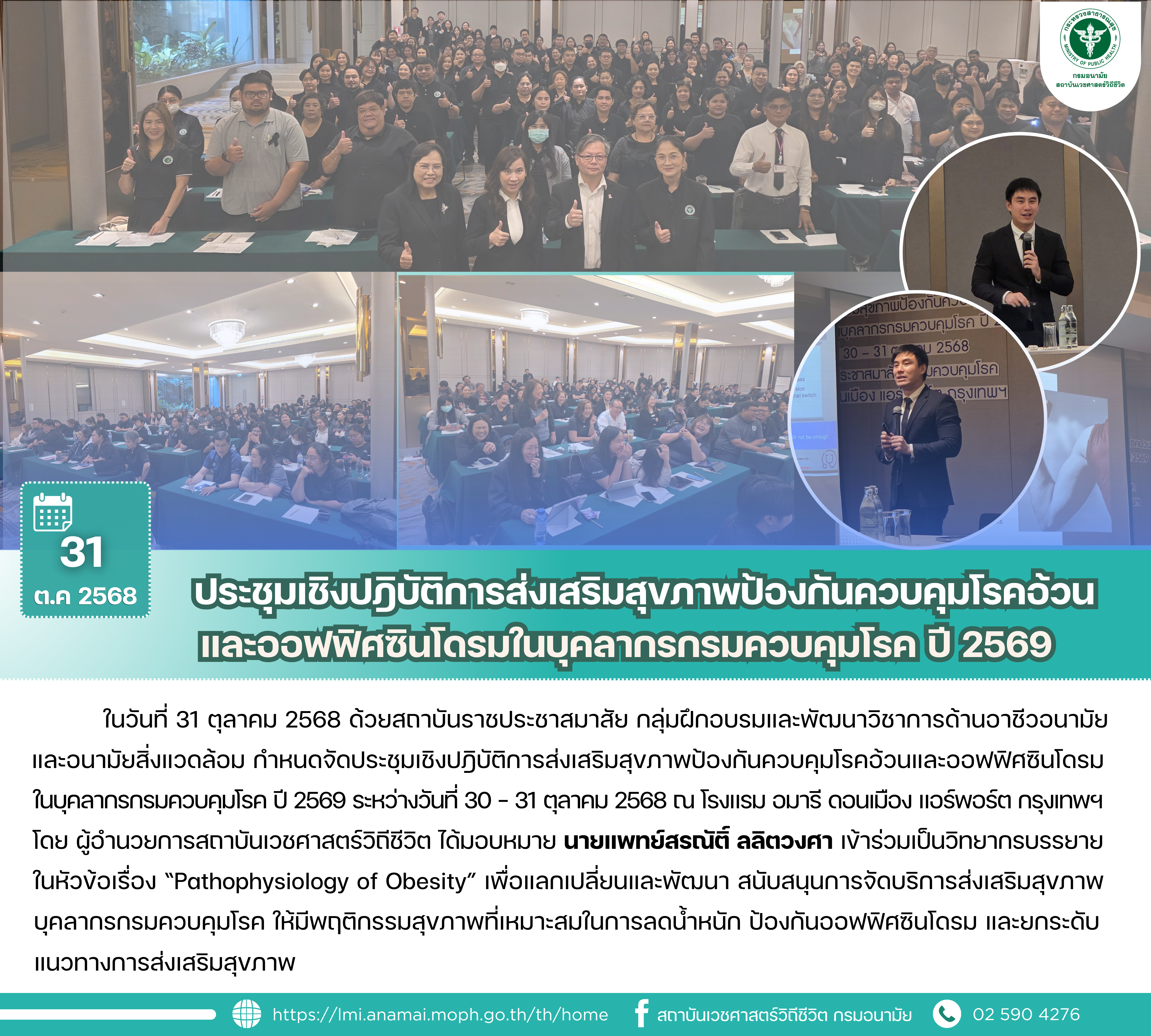วันที่ 31 ตุลาคม 2568 ด้วยสถาบันราชประชาสมาสัย กลุ่มฝึกอบรมและพัฒนาวิชาการด้านอาชีวอนามัย และอนามัยสิ่งแวดล้อม กำหนดจัดประชุมเชิงปฎิบัติการส่งเสริมสุขภาพป้องกันควบคุมโรคอ้วนและออฟฟิศซินโดรมในบุคลากรกรมควบคุมโรค ปี 2569 ระหว่างวันที่ 30 - 31 ตุลาคม 2568 ณ โรงแรม อมารี ดอนเมือง แอร์พอร์ต กรุงเทพฯ โดย ผู้อำนวยการสถาบันเวชศาสตร์วิถีชีวิต ได้มอบหมาย นายแพทย์สรณัติ์ ลลิตวงศา เข้าร่วมเป็นวิทยากรบรรยายในหัวข้อเรื่อง “Pathophysiology of Obesity” เพื่อแลกเปลี่ยนและพัฒนา สนับสนุนการจัดบริการส่งเสริมสุขภาพบุคลากรกรมควบคุมโรค ให้มีพฤติกรรมสุขภาพที่เหมาะสมในการลดน้ำหนัก ป้องกันออฟฟิศซินโดรม และยกระดับแนวทางการส่งเสริมสุขภาพ