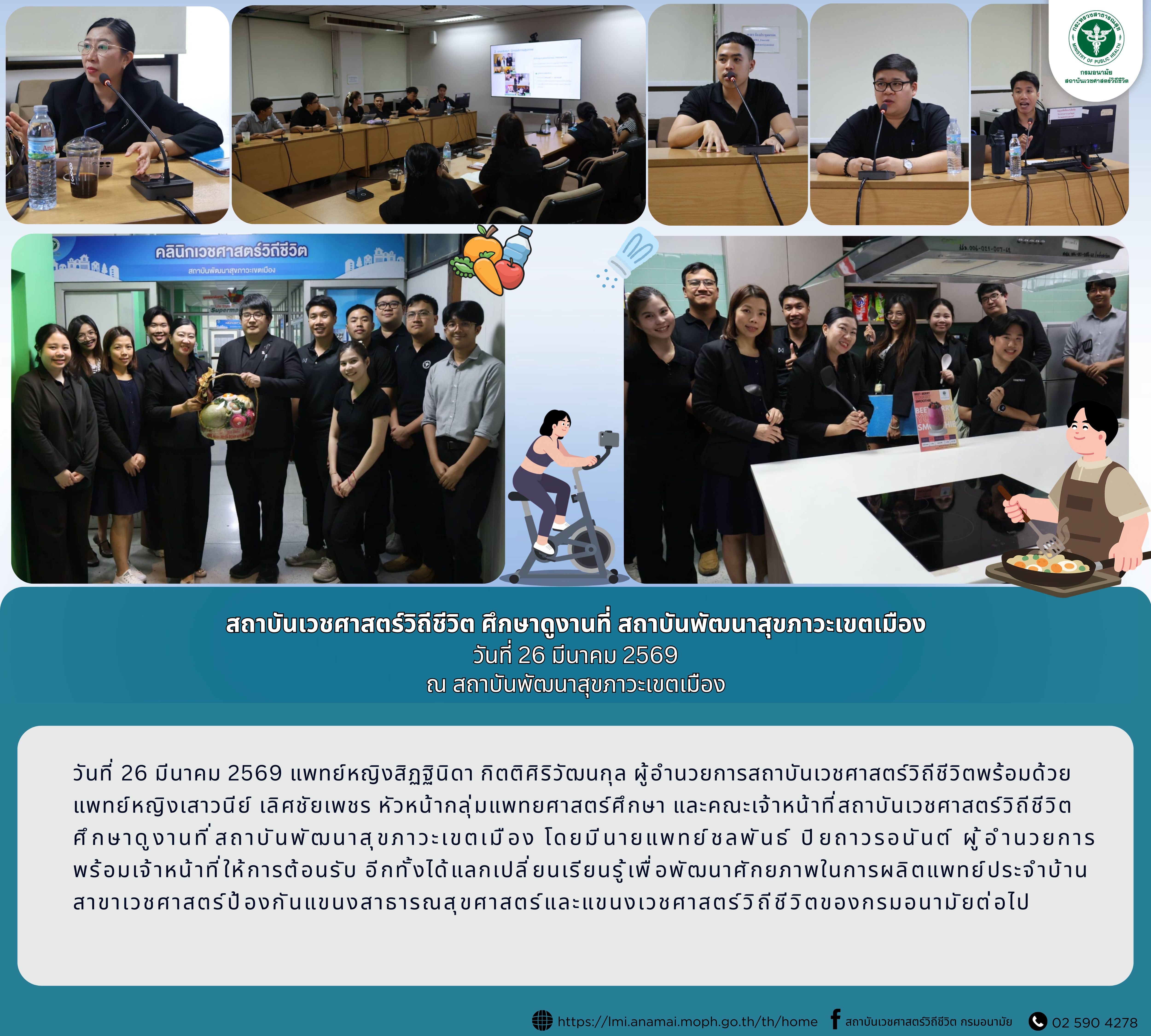 วันที่ 26 มีนาคม 2569 แพทย์หญิงสิฏฐินิดา กิตติศิริวัฒนกุล ผู้อำนวยการสถาบันเวชศาสตร์วิถีชีวิตพร้อมด้วยแพทย์หญิงเสาวนีย์ เลิศชัยเพชร หัวหน้ากลุ่มแพทยศาสตร์ศึกษา และคณะเจ้าหน้าที่สถาบันเวชศาสตร์วิถีชีวิตศึกษาดูงานที่สถาบันพัฒนาสุขภาวะเขตเมือง โดยมีนายแพทย์ชลพันธ์ ปิยถาวรอนันต์ ผู้อำนวยการ พร้อมเจ้าหน้าที่ให้การต้อนรับ อีกทั้งได้แลกเปลี่ยนเรียนรู้เพื่อพัฒนาศักยภาพในการผลิตแพทย์ประจำบ้านสาขาเวชศาสตร์ป้องกันแขนงสาธารณสุขศาสตร์และแขนงเวชศาสตร์วิถีชีวิตของกรมอนามัยต่อไป