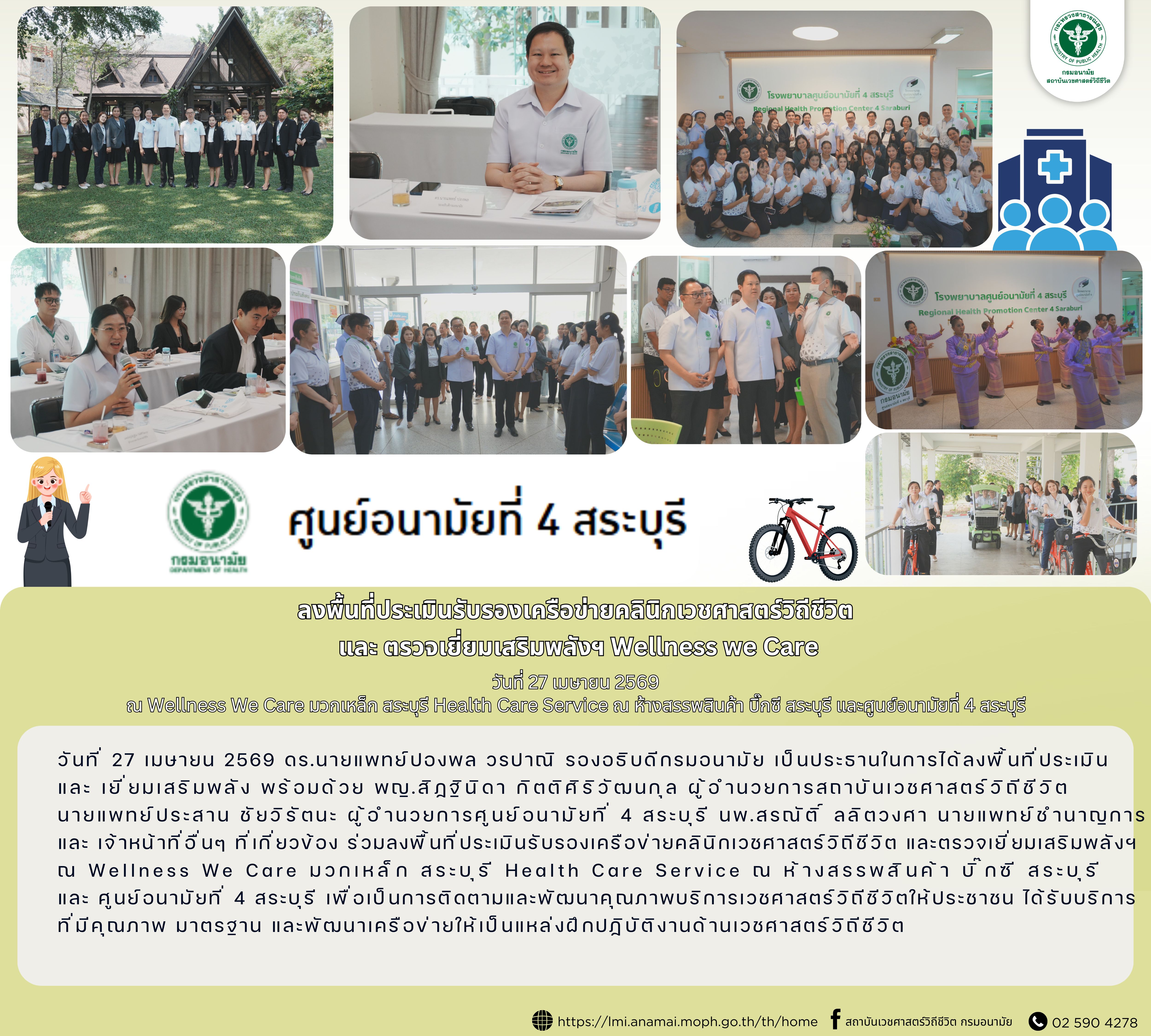 พร้อมด้วย พญ.สิฏฐินิดา กิตติศิริวัฒนกุล ผู้อำนวยการสถาบันเวชศาสตร์วิถีชีวิต นายแพทย์ประสาน ชัยวิรัตนะ ผู้อำนวยการศูนย์อนามัยที่ 4 สระบุรี นพ.สรณัติ์ ลลิตวงศา นายแพทย์ชำนาญการ และ เจ้าหน้าที่อื่นๆ ที่เกี่ยวข้อง ร่วมลงพื้นที่ประเมินรับรองเครือข่ายคลินิกเวชศาสตร์วิถีชีวิต และตรวจเยี่ยมเสริมพลังฯ ณ Wellness We Care มวกเหล็ก สระบุรี Health Care Service ณ ห้างสรรพสินค้า บิ๊กซี สระบุรี และศูนย์อนามัยที่ 4 สระบุรี เพื่อเป็นการติดตามและพัฒนาคุณภาพบริการเวชศาสตร์วิถีชีวิตให้ประชาชน ได้รับบริการที่มีคุณภาพ มาตรฐาน และพัฒนาเครือข่ายให้เป็นแหล่งฝึกปฏิบัติงานด้านเวชศาสตร์วิถีชีวิต